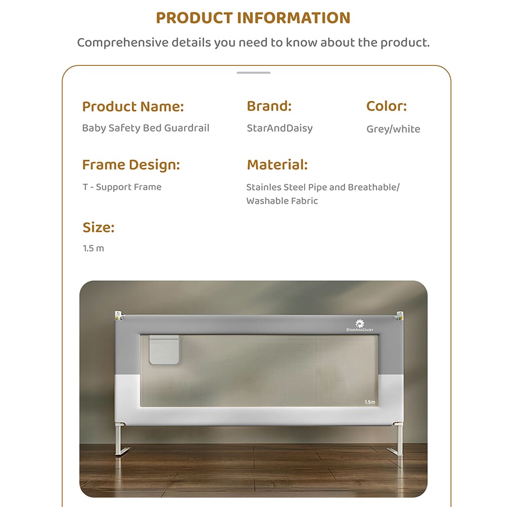 - Harmless Materials: Carefully crafted from non-toxic, child-safe materials, this guardrail ensures your baby’s safety and well-being. You can trust that every part is free from harmful chemicals, making it perfect for everyday use around your little one